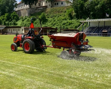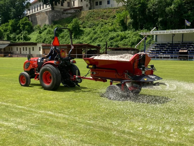 zapravení písku a směsí do dutin po aerifikaci vegetační vrstvy a celkové urovnání povrchu hřiště